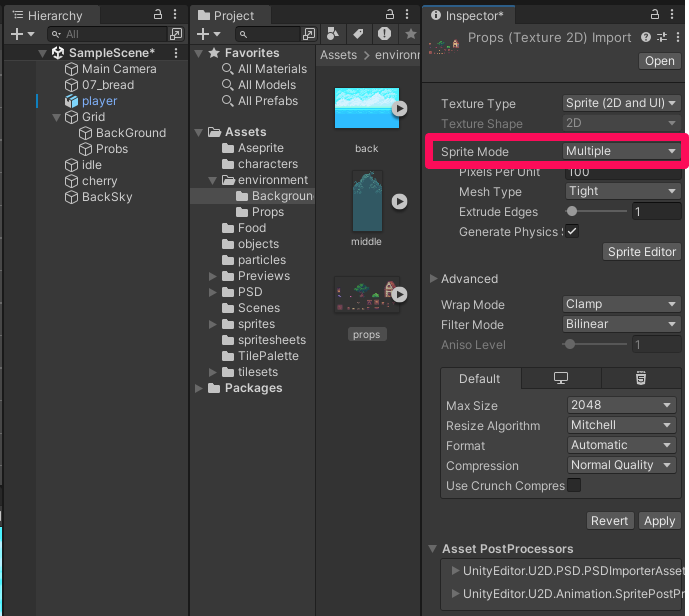 2. Sprite Mode는 Multiple (Splite Editor에서 Slice 조절 목적)