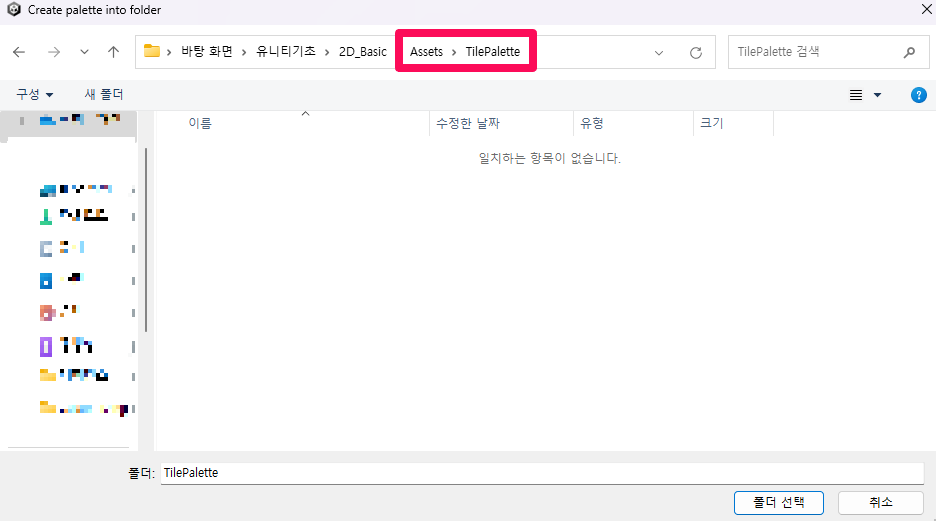 새 파일 만들어서 TilePalette 라고 이름 변경 후 폴더 선택을 클릭하였습니다.