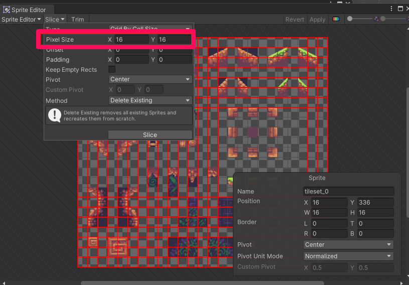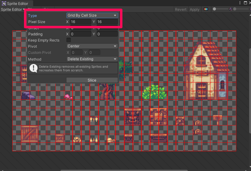 Sprite Editor에서 Grid By Cell Size로 바꾸고 X 16, Y 16 변경합니다.