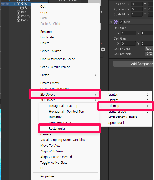 Grid 우클릭 → 2D Object → Tilemap → Rectangular