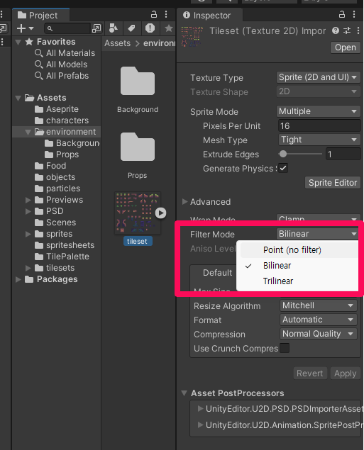 Inspector 창에서 Filter Mode를 Point로 설정하면 땅을 만들었을 때 타일이 깨지지않고 합쳐집니다.
