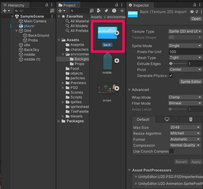 BackGround처럼 Pixels Per Unit도 100 → 16으로 변경합니다.