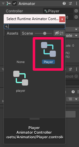 Player의 Animator 컨트롤러를 Player로 수정했습니다.