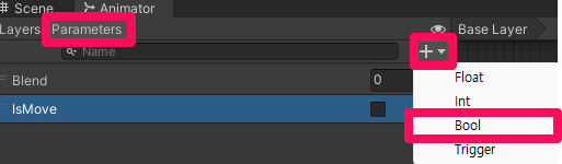 왼쪽의 Paramaters 에서 + 버튼을 눌러 Bool로 추가했습니다.