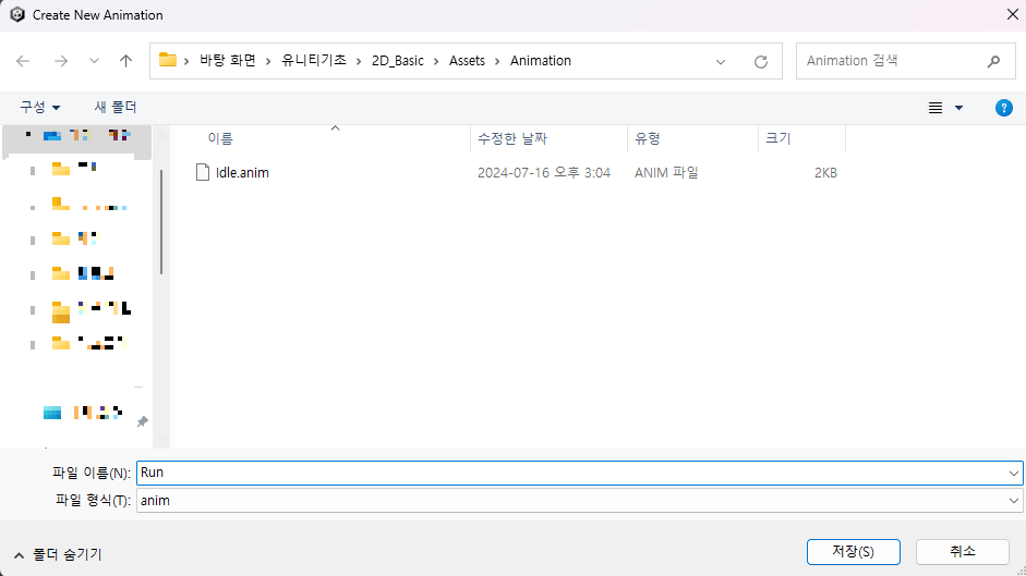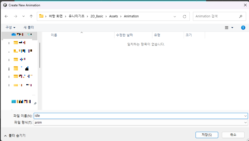 Create 누르고 유니티 파일의 Asset에 Animation으로 새 폴더를 추가했습니다.