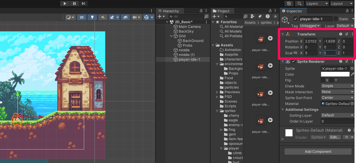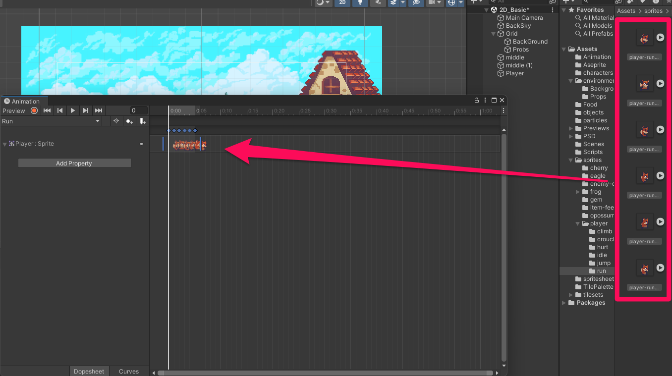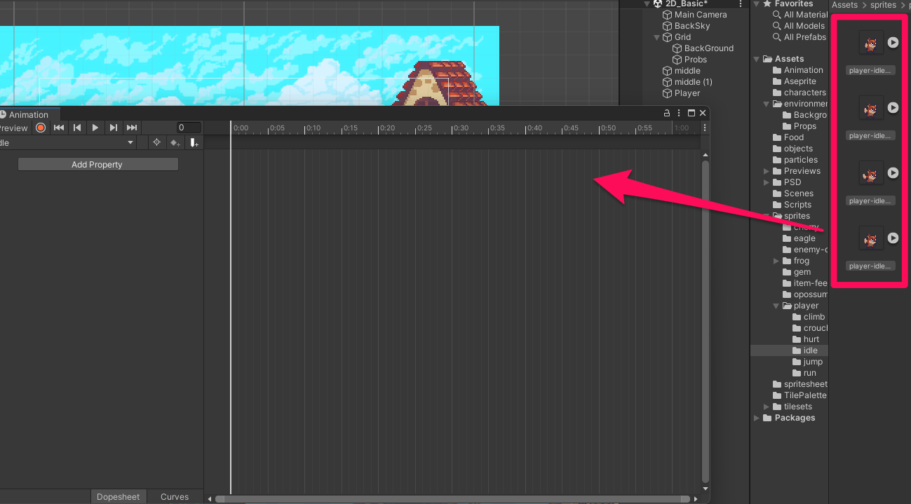 Project 창에서 Player 안의 Idle 중 하나를 드래그하여 가져옵니다.