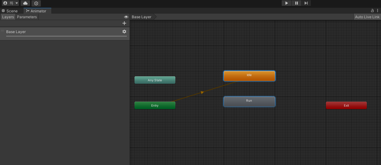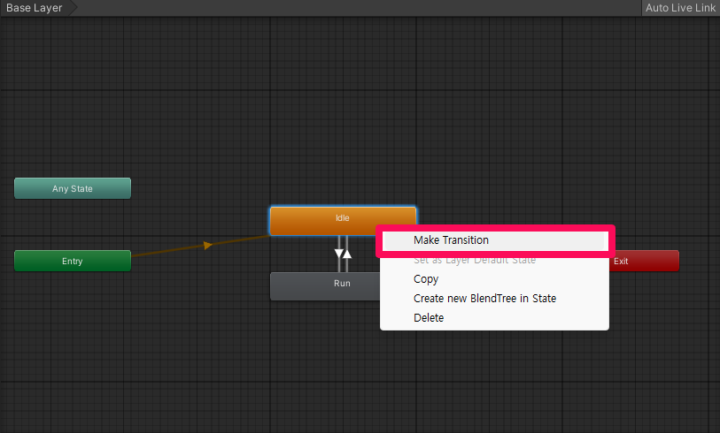 Idle이나 Run을 선택한 상태에서 마우스 우클릭으로 Make Transition을 누르고 양방향 화살표를 만듭니다.
