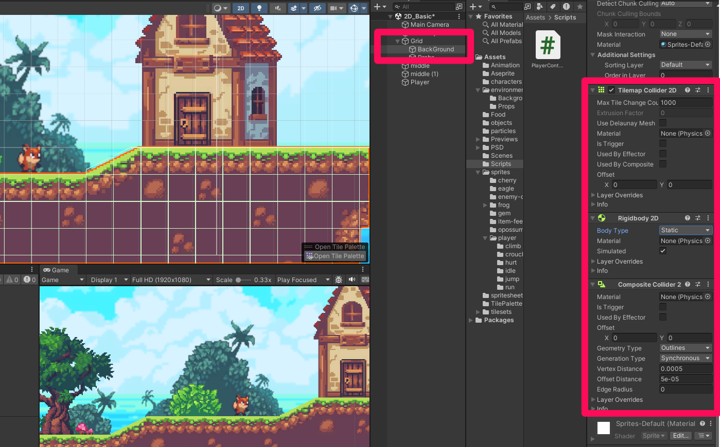TilemapCollider 2D에서 Used By Composite에 체크하면 타일이 개별이 아니라 결합되기에 성능이 최적화됩니다.