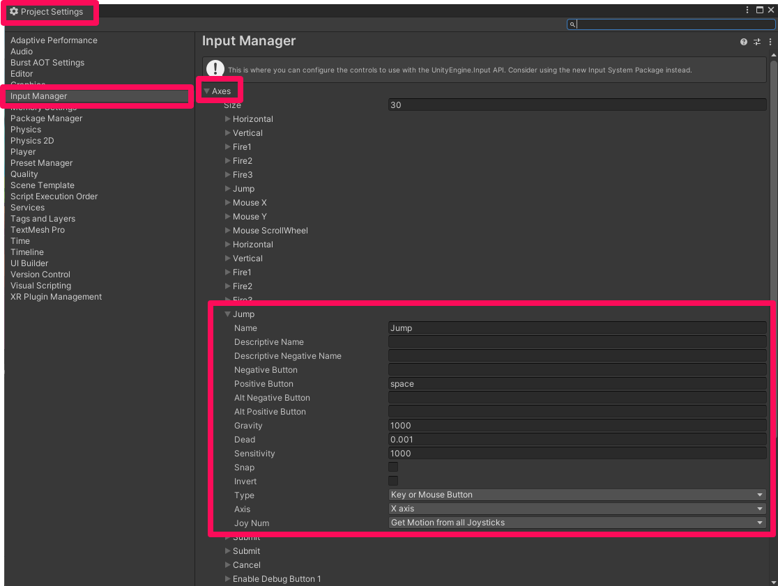 Input Manager에서 Axis를 누르고 Jump를 수정합니다.