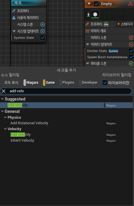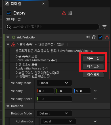 파티클 스폰에 Add Velocity 모듈을 추가하고 오른쪽 디테일 패널에서 이슈 고침을 클릭합니다.