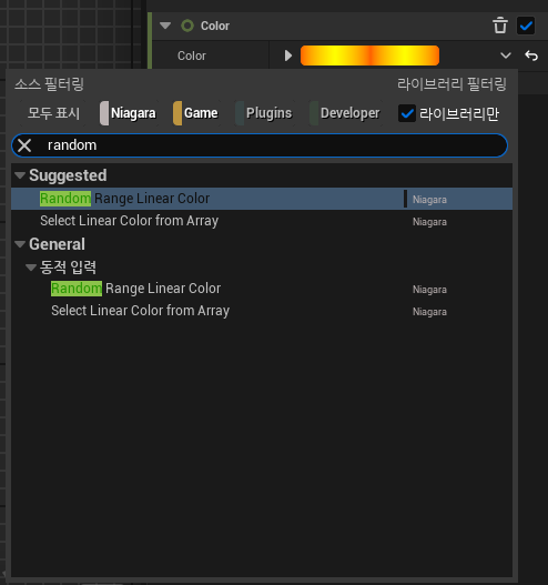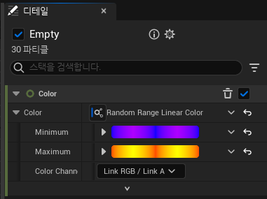 Color 모듈에서 Random Range Linear Color로 바꾸면 맥시멈과 미니멈을 설정하여 컬러를 다양하게 바꿀 수 있습니다.