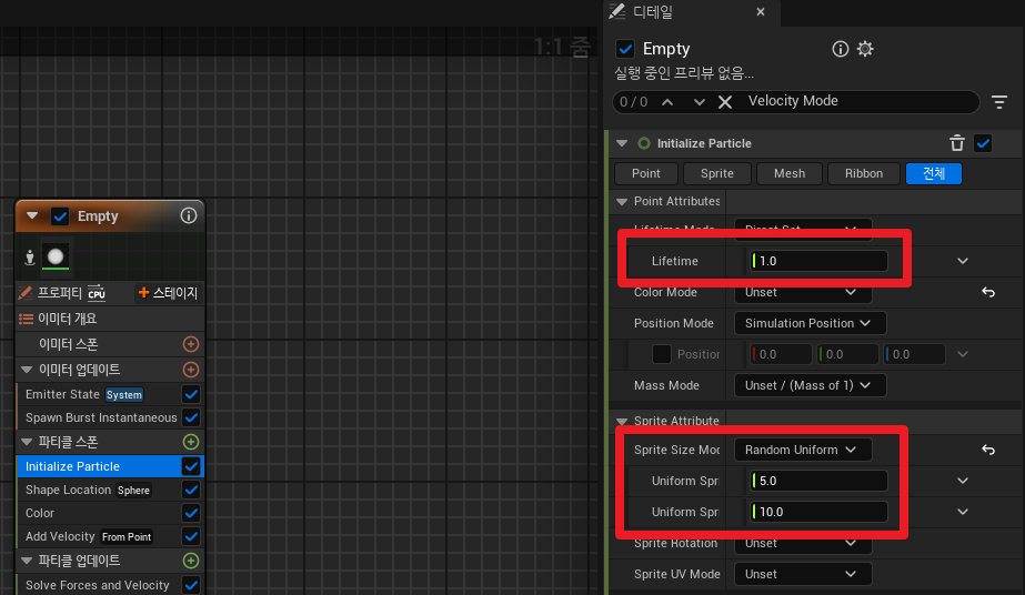 Initialize Particle에서 Lifetime을 1로 하여 이펙트가 터지고 1초 후 사라지게 합니다.