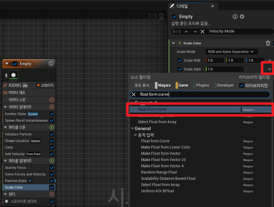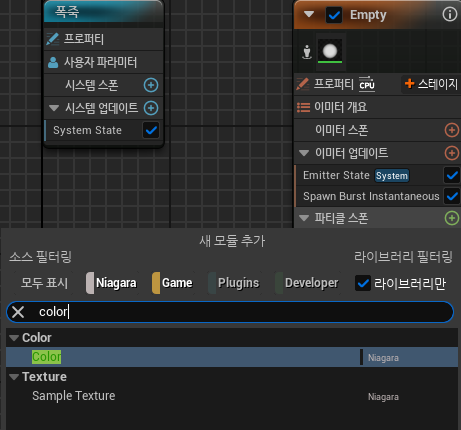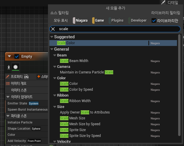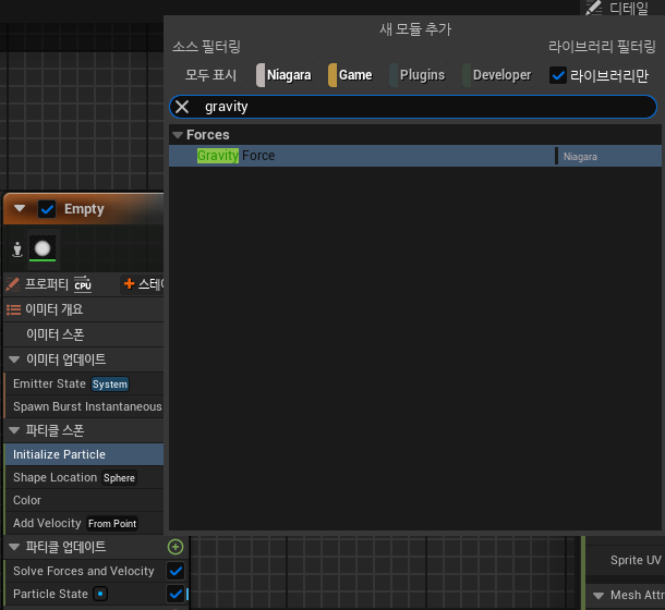 파티클 업데이트에 Gravity Force 모듈과 Scale Color 모듈을 추가했습니다.