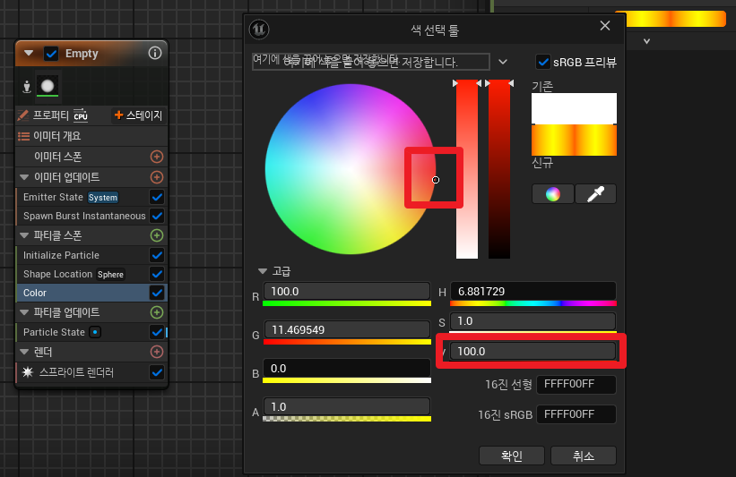 빨간색으로 하고 V(명도)를 100으로 하여 빛나는 효과를 줍니다.