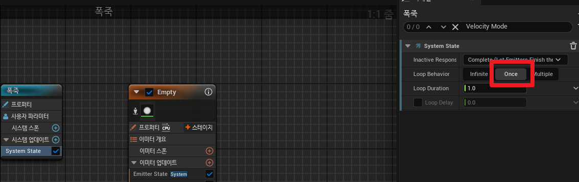 폭죽이 터졌을 때 한 번만 이펙트가 나오도록 하기 위해 System State에서 Once로 변경합니다.