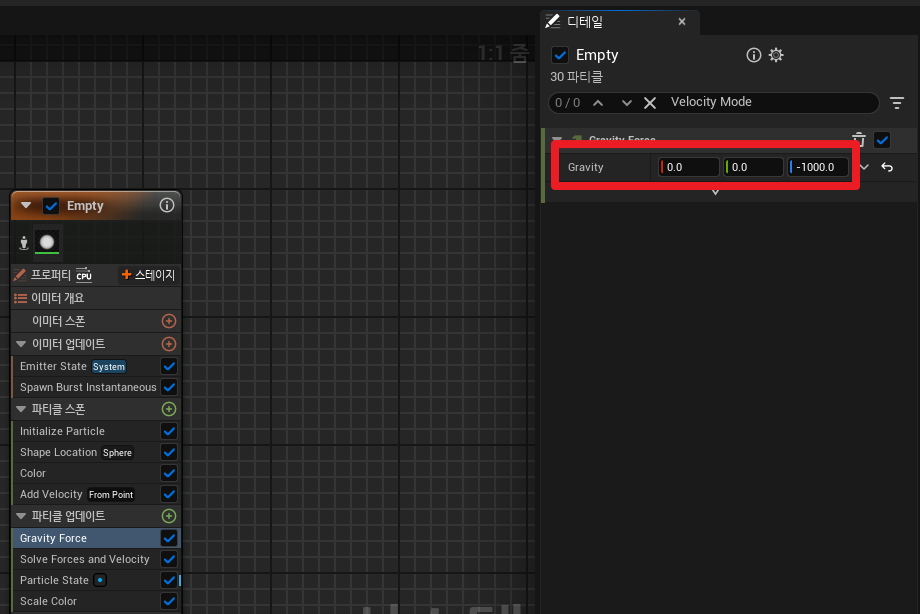 Gravity Force에서 Z축을 -1000으로 하면 중력에 의해 파티클이 퍼지면서 천천히 내려앉는 걸 볼 수 있습니다.