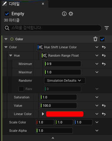 Linear Color는 새로운 로컬 값으로 설정하여 빨강을 만들고 Hue에 Random Range Float를 추가했습니다.