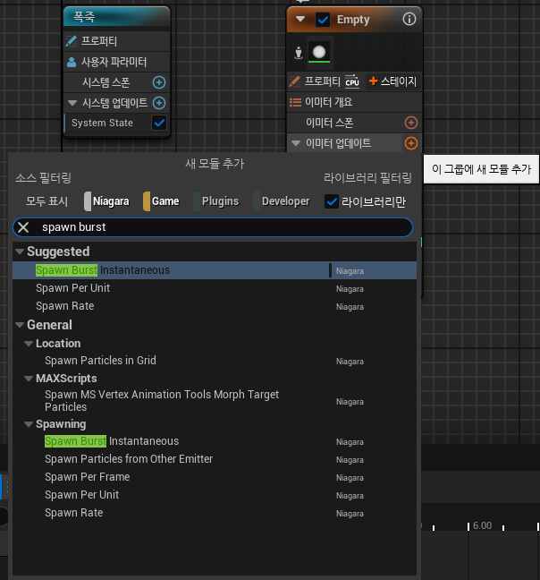이미터 업데이트에 + 버튼을 눌러 Spawn Burst Instantaneous를 추가해 주고 오른쪽 디테일 패널에서 Spawn Count를 30으로 했습니다.