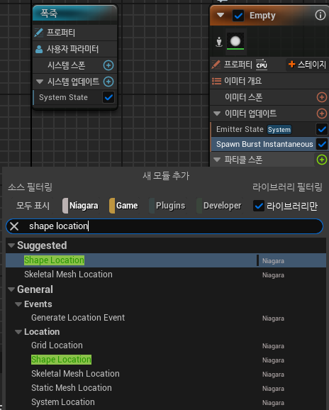 파티클 스폰에서 + 버튼을 눌러 Shape Location과 Color 모듈을 추가합니다.
