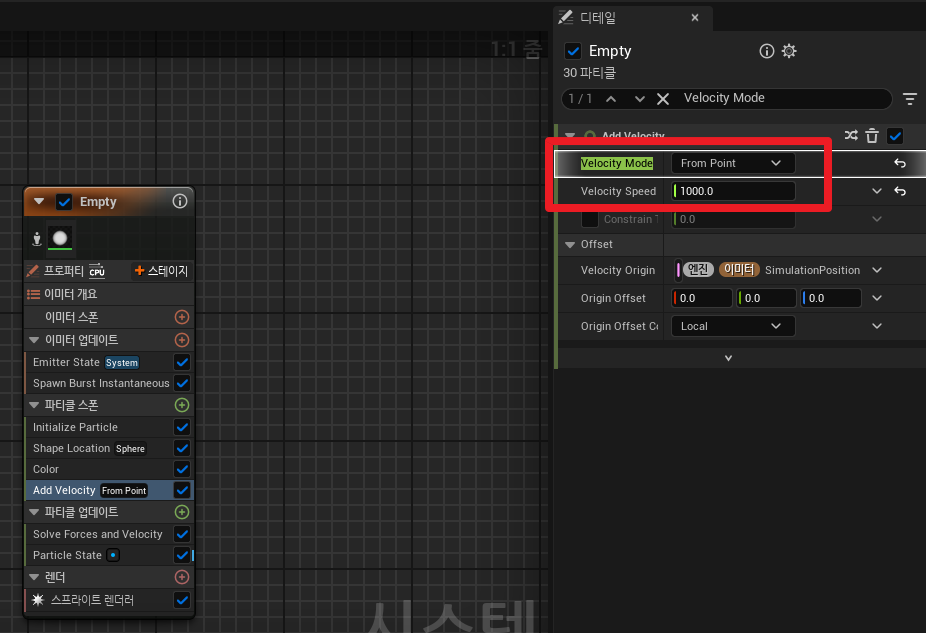 Add Velocity의 Mode를 From Point로 변경하면 한 점에서 사방으로 퍼지게 됩니다.