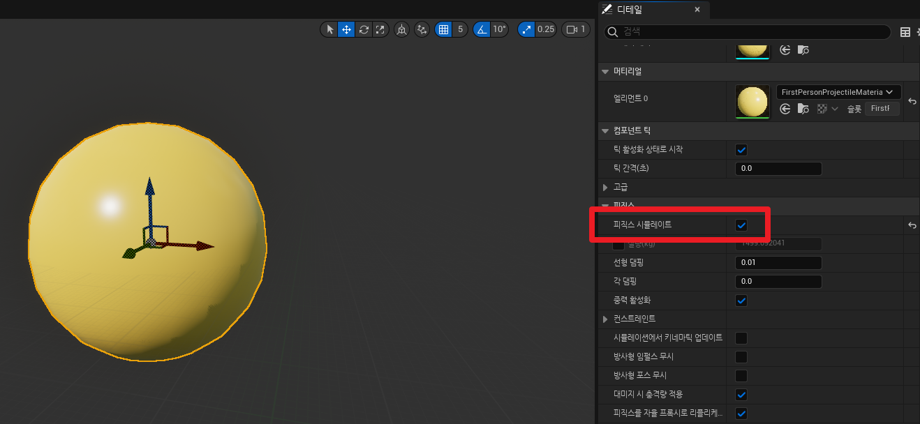 발사체가 너무 크다면 오른쪽 트랜스폼에서 스케일을 조정하면 됩니다. (1→0.2로 변경)
