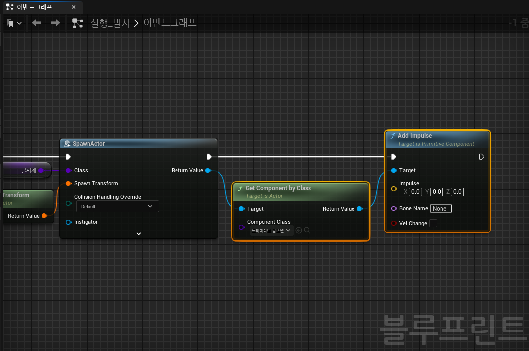 여기에 Add Impulse 노드를 추가하여 발사체가 발사되는 것처럼 만들 수 있습니다.