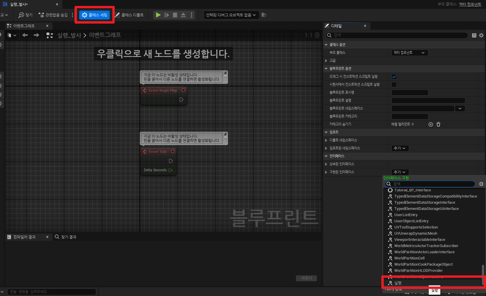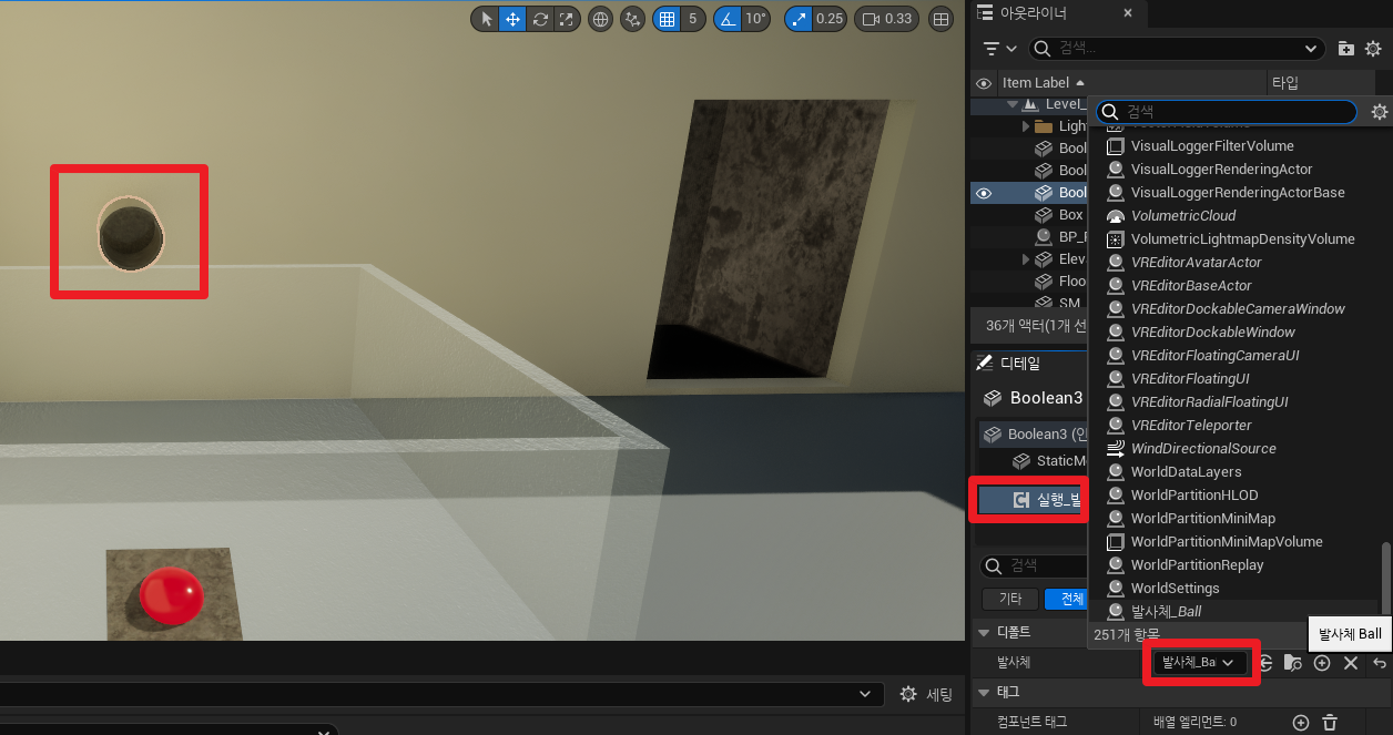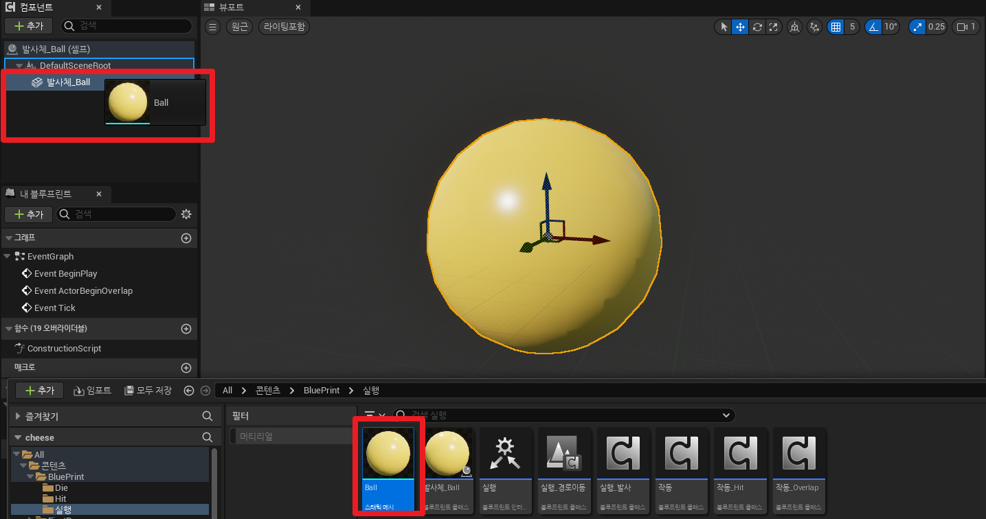 공이 나올 곳에는 실행_발사 컴포넌트를 넣어줍니다. (실행대상으로 선택한 액터와 동일)