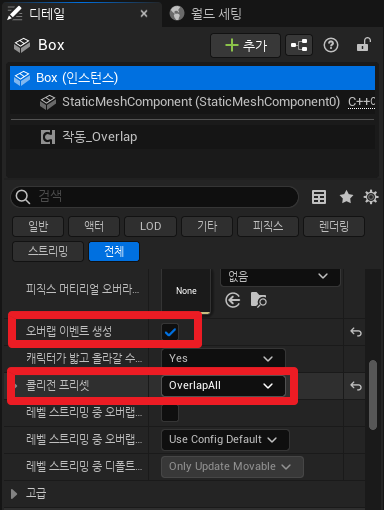 실행대상을 스포이드를 통해 선택해 주고 오버랩 이벤트 생성에 체크, OverlapAll로 콜리전을 바꿔줍니다.