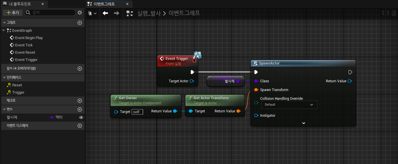 Spawn Transform은 Get Owner 노드를 통해 Get Actor Transform 노드를 가져와 연결했습니다.