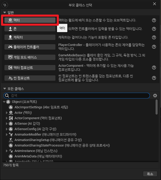 새로운 블루프린트 클래스 액터를 만듭니다.