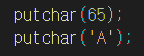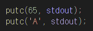 단일 문자만 출력할 수 있으며, putchar 괄호 안에 아스키(ASCII)값이나 작은따옴표(' ')로 감싼 문자를 넣습니다.