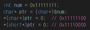 값이 0x11111111(16진수) 인 num 변수에 형 변환을 통해 일부만 값을 변경할 수 있습니다.