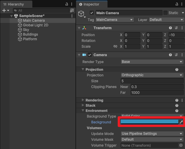자연스러운 배경을 위해 Main Camera의 Background를 변경한다.