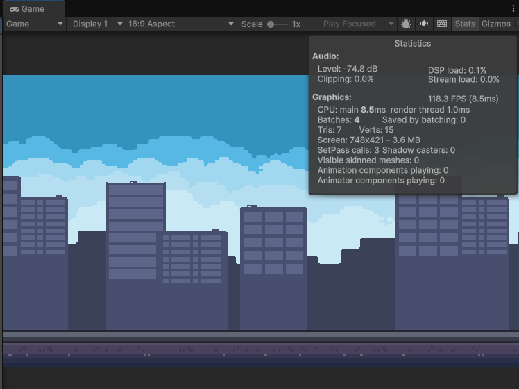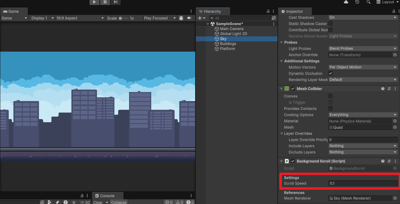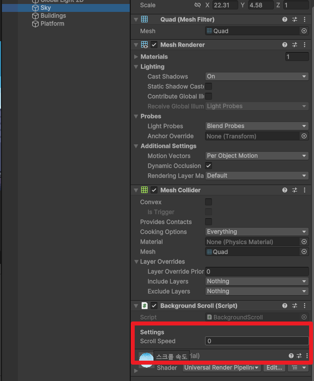 Scroll Speed를 Sky는 0.1, Buildings는 0.2, Platform은 0.8로 변경하여 원근감이 느껴지도록 했다.