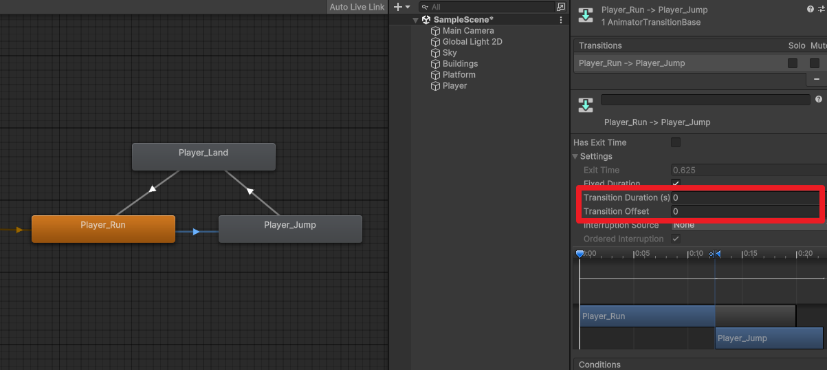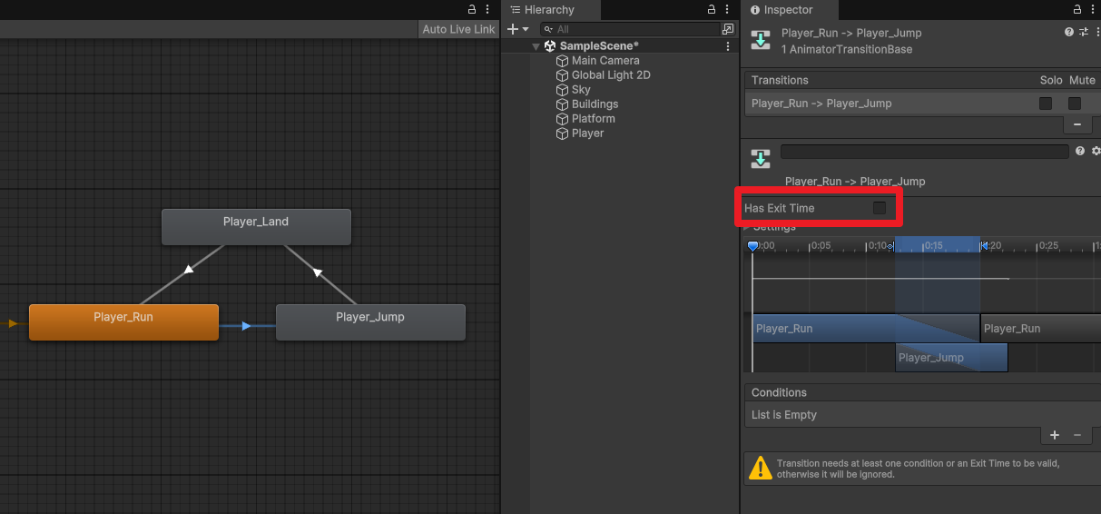 Run->Jump, Jump->Land는 Has Exit Time 체크 해제한다.