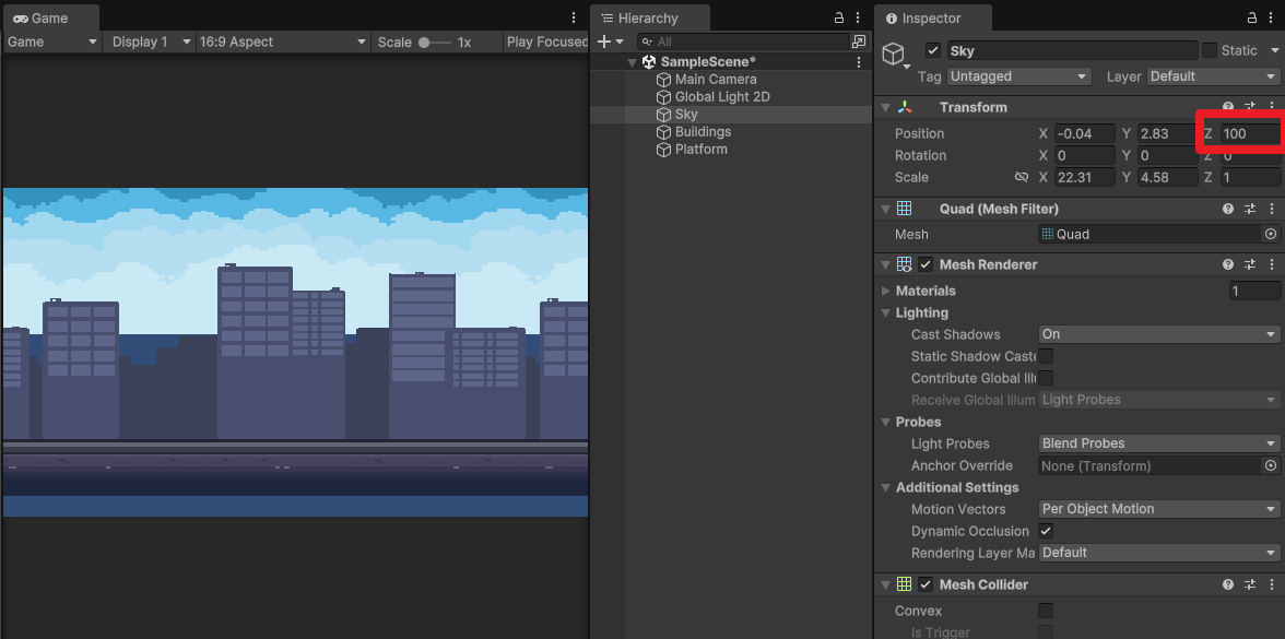 Sky는 100, Buildings는 90, Platform은 80으로 설정했다.