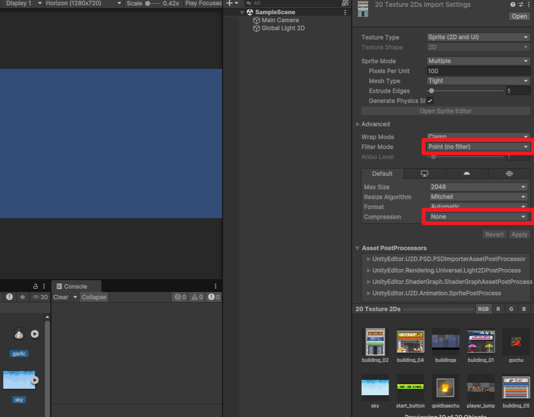 Filter Mode를 Point (no filter)로 설정하고, Compression을 None으로 설정하여 압축을 하지 않도록 한다.
