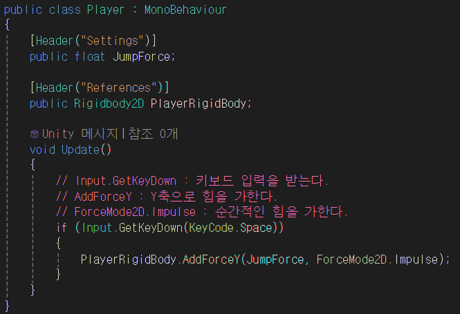 PlayerRigidBody 변수를 만들고 Update 메서드에 코드를 작성한다.