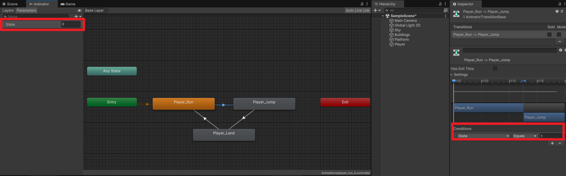 Run→Jump로 갈 때는 Equals 1, Jump→Land로 갈 때는 Equals 2로 추가했다.