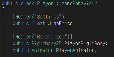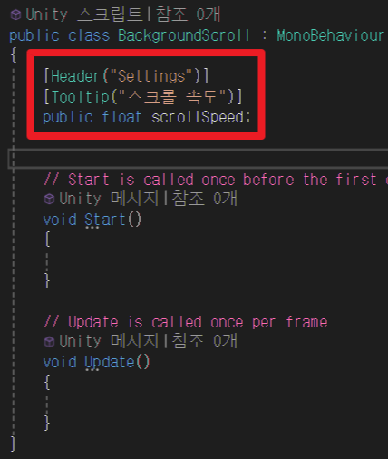 Header와 Tooltip을 코드에 추가하여 Inspector 창에 스크립트에 대한 설명을 할 수 있다.