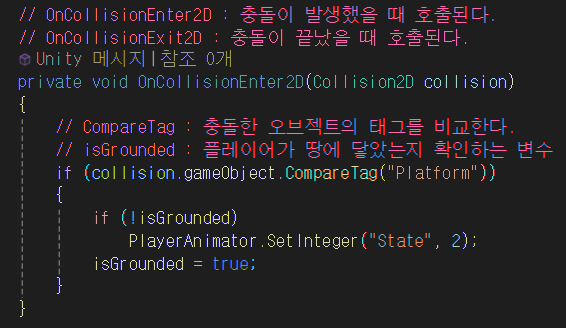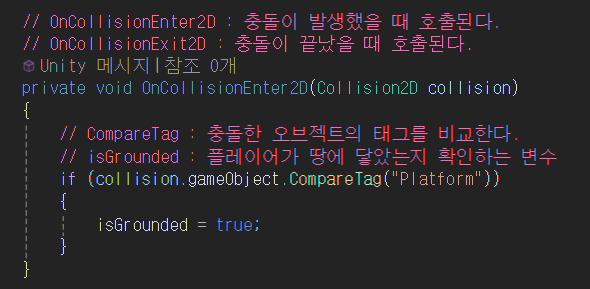 Platform 태그의 오브젝트와 충돌하면 isGrounded 변수를 true로 만든다.