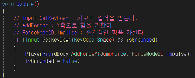 플레이어가 키를 눌러 Y축으로 힘이 가해지면 isGrounded가 false가 되고, 중력에 의해 다시 내려와 땅에 닿으면 다시 isGrounded는 true가 되어 반복한다.