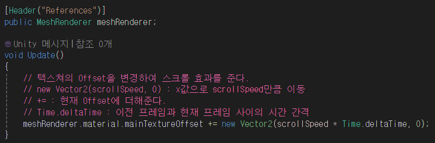meshRenderer를 통해 머티리얼의 오프셋 값을 변경할 수 있다.