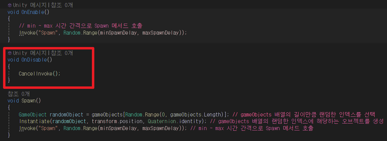 OnDisable 메서드를 추가해서 CancelInvoke 함수를 호출한다.