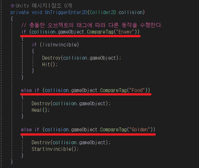 아래 OnTriggerEnter2D에 if문을 추가한다.