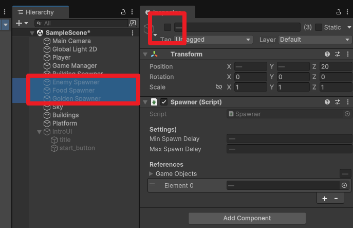 인스펙터에서 스포너들을 체크 해제하여 비활성화 되도록 한다.