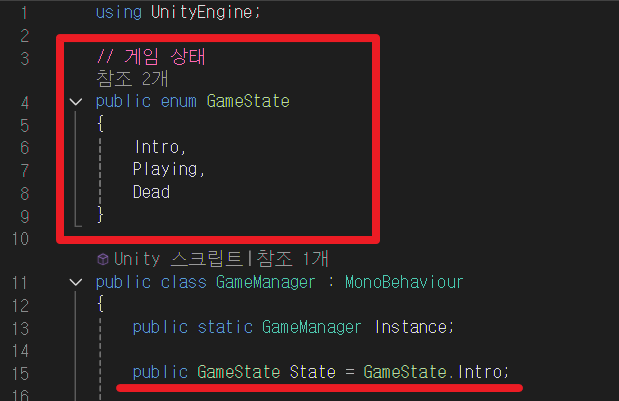 GameState 변수를 만들어 초기값은 Intro로 했다.