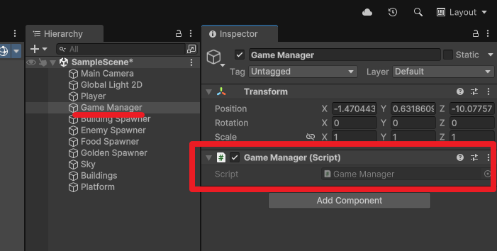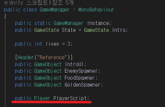GameManager 스크립트에 PlayerScript 변수를 추가한다.