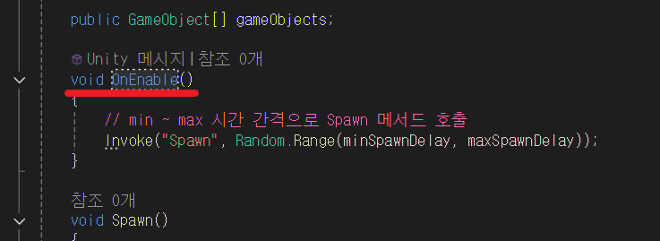 이제 스포너가 활성화되면 Invoke 메서드로 Spawn 함수를 호출하게 된다.