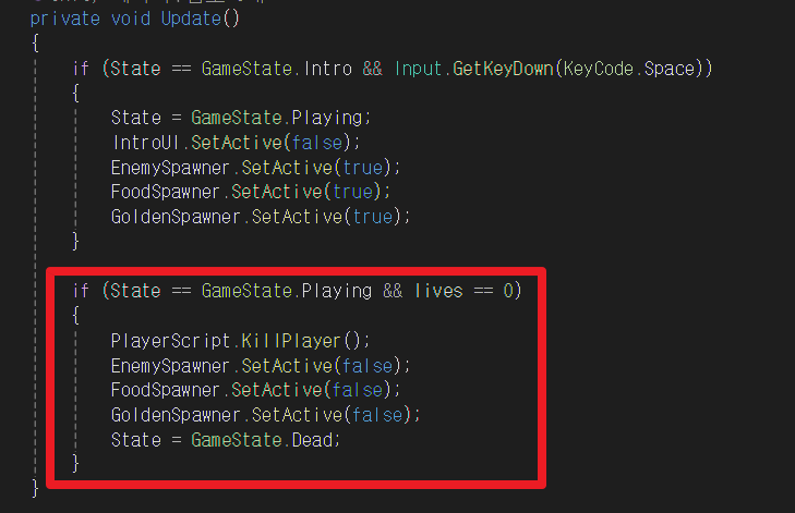 State가 Playing일 때 lives가 0이 되면 PlayerScript의 KillPlayer 함수가 호출되고, 스포너가 비활성화 되고, State가 Dead로 바뀐다.